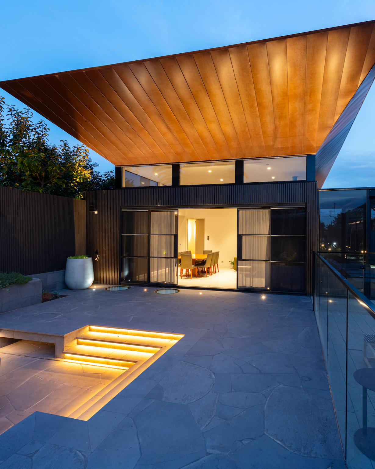 Between the two structures, a Japanese-inspired garden forms the critical seam. Stone, planting, and restrained lighting draw the architecture together, allowing heritage and contemporary forms to engage with ease. As daylight fades, the battens take on a soft, ambient glow, revealing their grain and amplifying the pavilion’s quiet architectural presence.