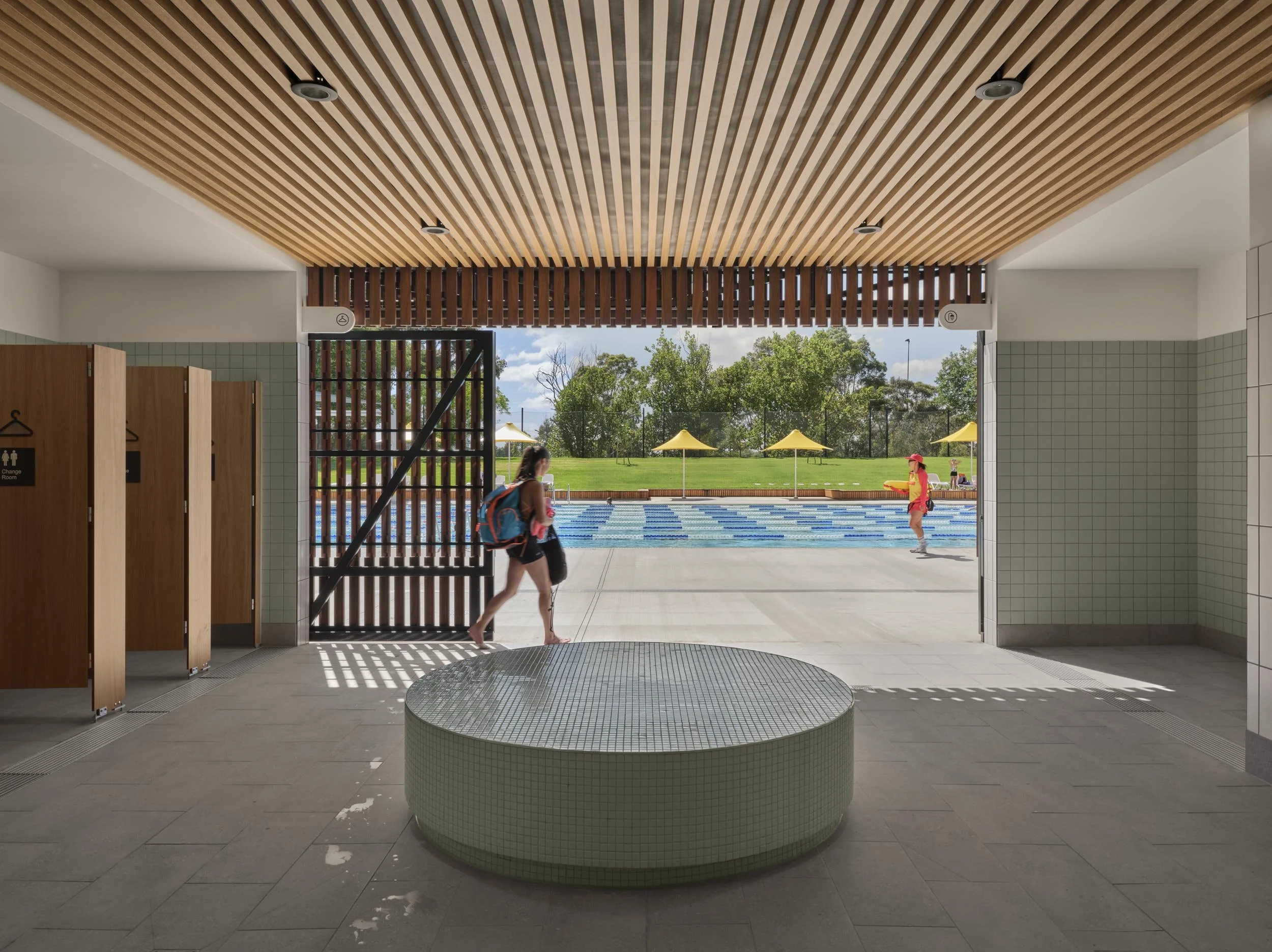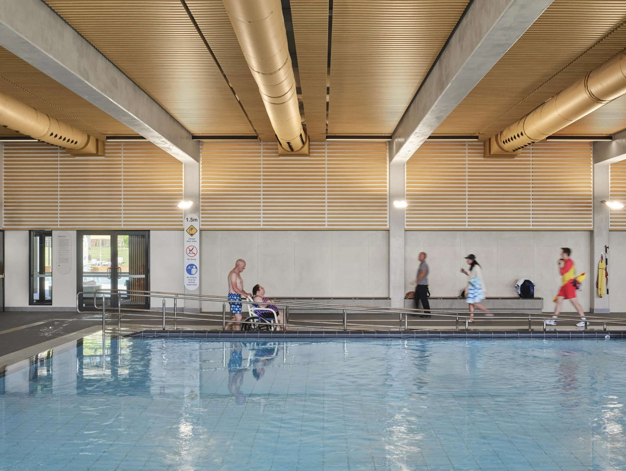 As a commercial aquatic facility, material selection was governed by strict performance requirements. The use of non-combustible, fire-rated aluminium battens addressed compliance needs while also responding to the highly humid pool environment, where natural timber would be susceptible to deterioration over time. The selected system delivers the appearance of timber alongside the dimensional stability and durability required for long-term public use.