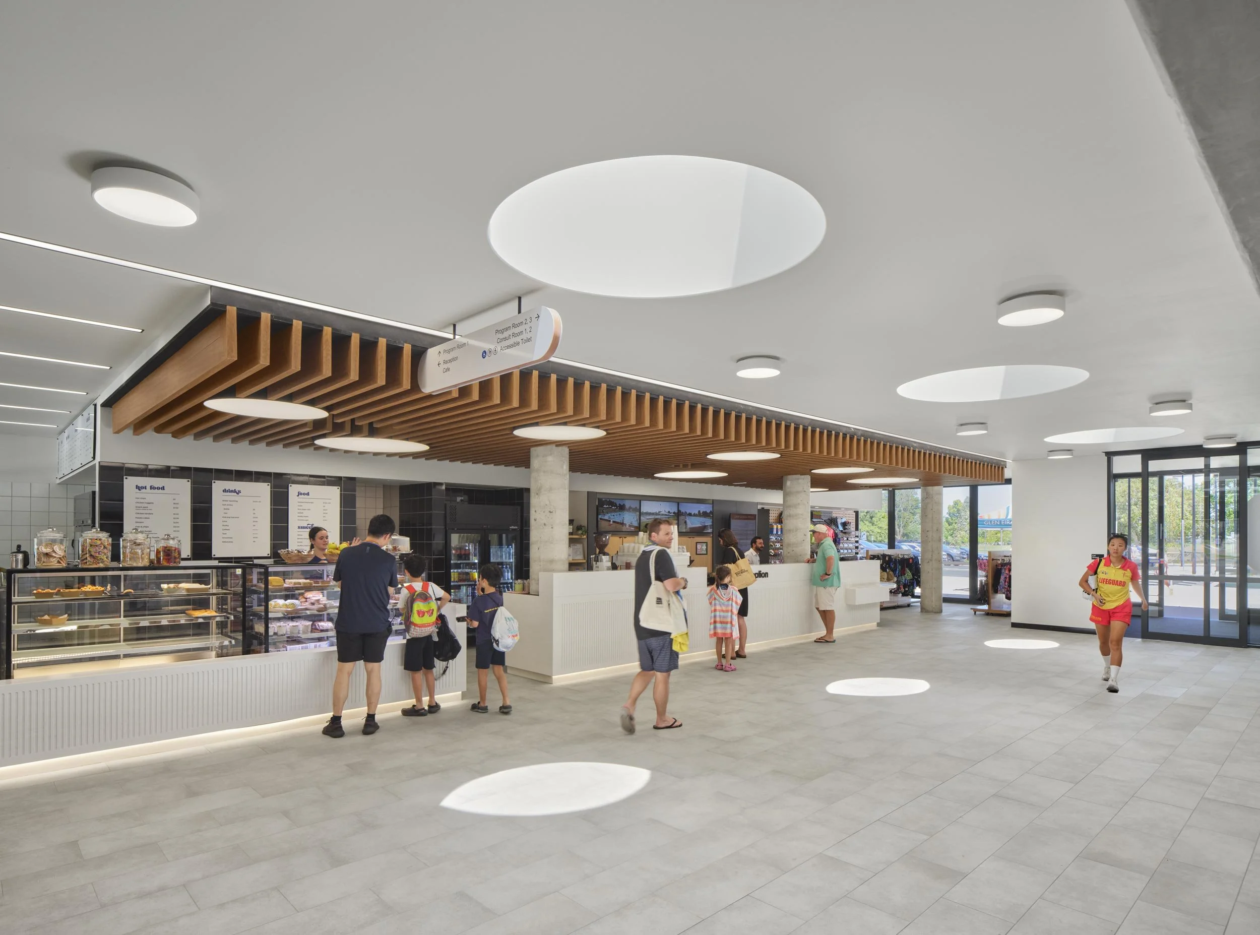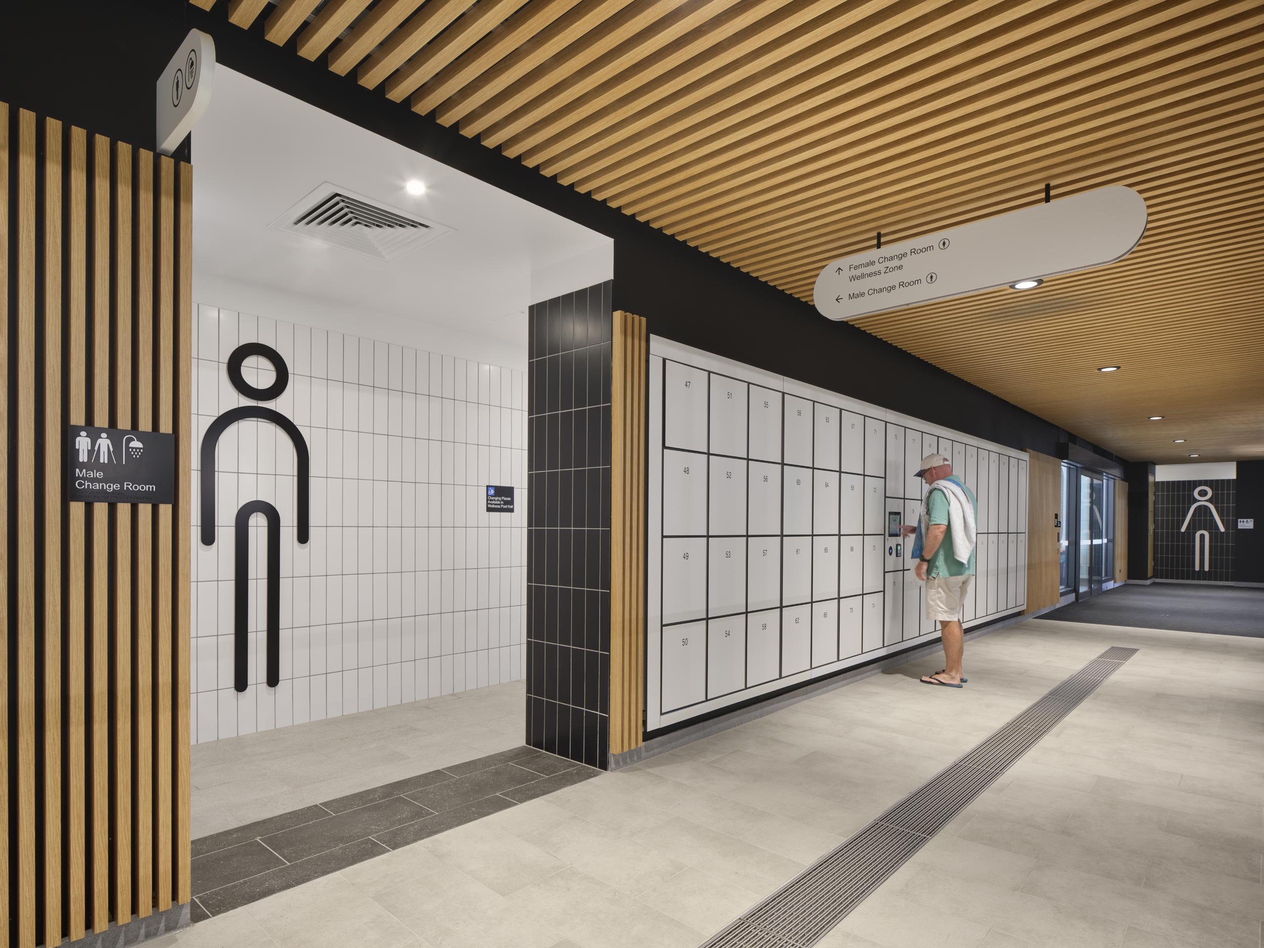 Covet was engaged early in the design process, working closely with the design team to explore colour options, profile sizes, and spatial applications suited to a high-use, humid aquatic environment. Through this collaborative process, Covet Kabebari timber-look aluminium battens were selected as a key interior material, responding to both the architectural intent and the functional demands of the building.
