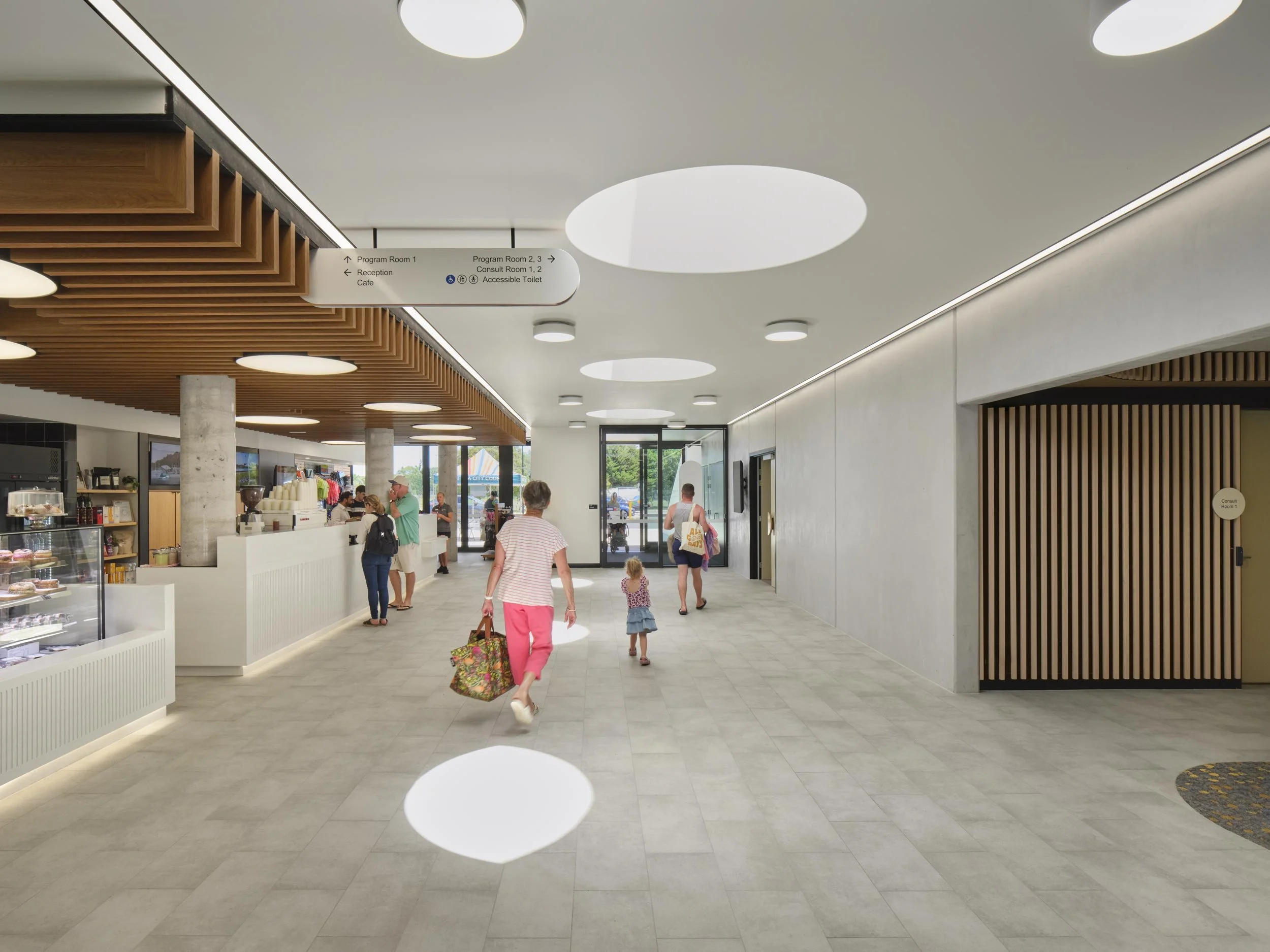 The completed Carnegie Leisure Centre delivers a refined yet highly functional civic interior, with timber-look aluminium battens playing a central role in shaping the architectural experience. The finished result closely reflects the original design intent, with the realised spaces exceeding initial visualisations.
