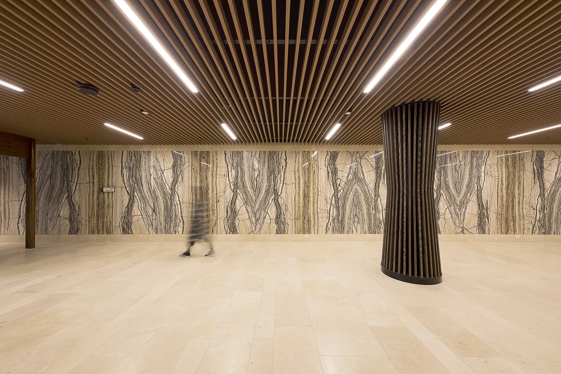 One of the first sights to greet residents when they walk into the building, the suspended batten ceiling creates a sense of warmth and luxury—the perfect combination to come home to.